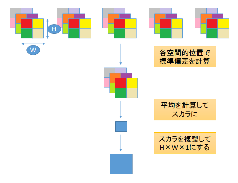 ① 미니배치 상의 각 공간위치에 있어 각 특징의 표준편차를 계산한다.