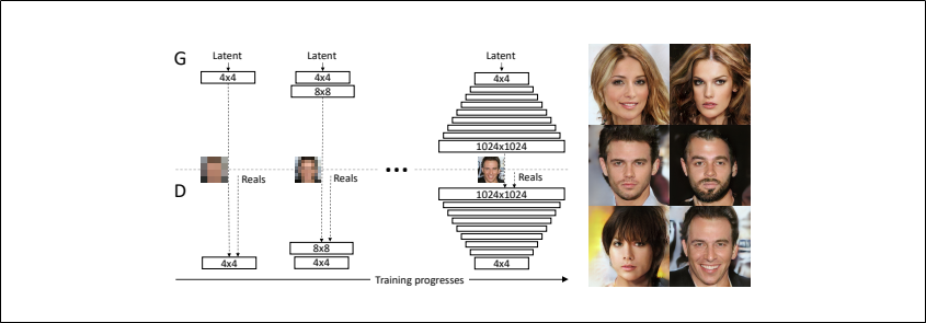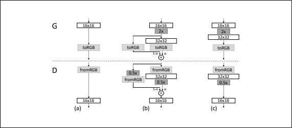 본 연구의 학습에서는 Generator과 Discriminator 각각 저해상도 (4x4)의 층으로 부터 시작하여 학습이 진행해감에 따라 조금씩 Generator과 Discriminator에 층을 추가해나가는 것으로 생성 이미지의 해상도를 향상시킨다.