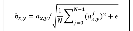 ε=10의−8승, N= 특징 맵의 수, ax,y = 픽셀(x, y)의 정규화전의 특징 벡터, bx,y = 픽셀(x, y)의 정규화한 특징 벡터