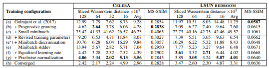 위 표는 다양한 학습 구성에서의 SWD(Sliced Wasserstein distance)과 MS-SSIM(multi-scale structural similarity)의 수치 평가를 표시한 것이다.