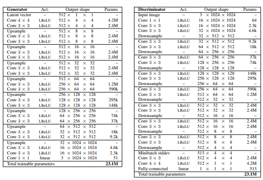 위 그림의 왼쪽은 Generator의 아키텍처이고 오른쪽은 Discriminator의 아키텍처이다. 둘 다 3층을 하나의 블록으로 한 것을 학습 도중에 1개씩 늘려 가며 쌓아갔다는 것을 알 수 있다.