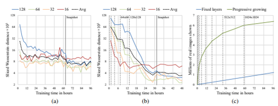위 그림(a)와 (b)는 훈련 시간(가로 축)과 SWD의 수치 (세로 축), 그림 (c)는 훈련 시간(가로 축)과 Discriminator에게 보여준 진짜 이미지의 숫자(세로 축)이다.