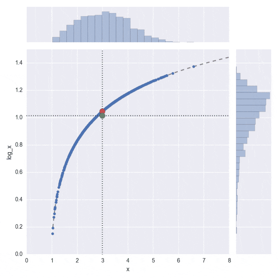 이 부등식 f(E[x])≥E[f(x)] 을 직감적으로 이해하기 위해 난수를 이용한 예를 그래프로 표시해보도록 하겠습니다.