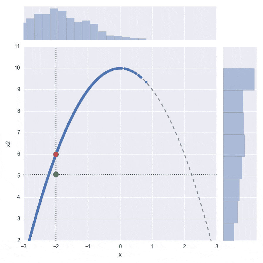 x의 분포가 어떤 정규분포의 평균을 조금씩 미뤄가며 애니메이션화시켜 본 것이 아래와 같다. 어떠한 경우에서도 녹색의 동그라미가 빨간 색 동그라미보다 아래에 있다는 것을 알 수 있다.