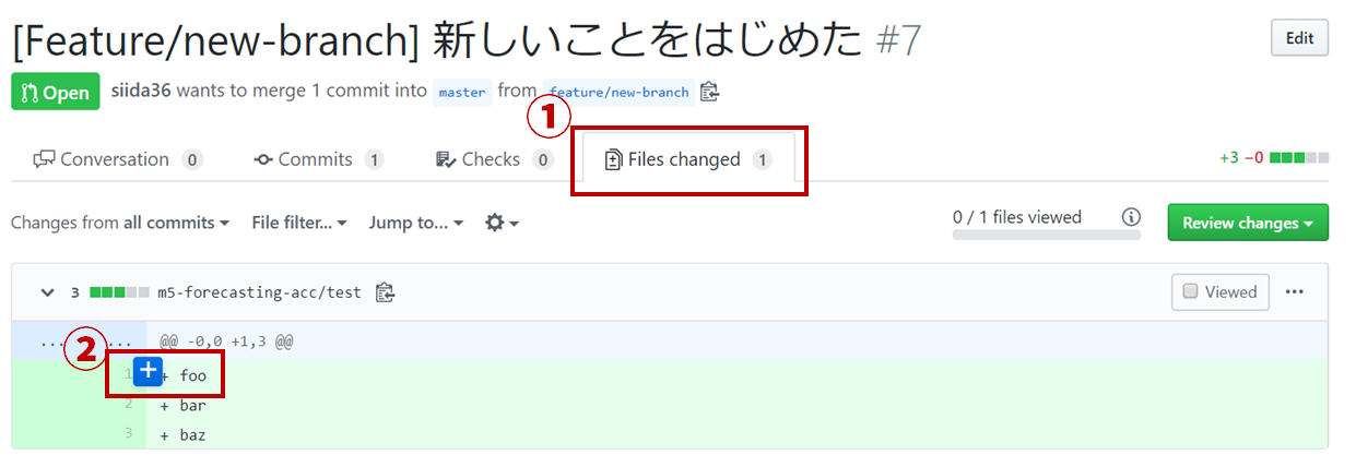 PR에서는 [Files changed]를 누르면, 파일의 변경점을 볼 수 있는 화면으로 이동하게 된다. 각 행에 마우스 커서를 올리면 "+" 버튼이 나오므로 리뷰하고 싶은 곳을 클릭한다.