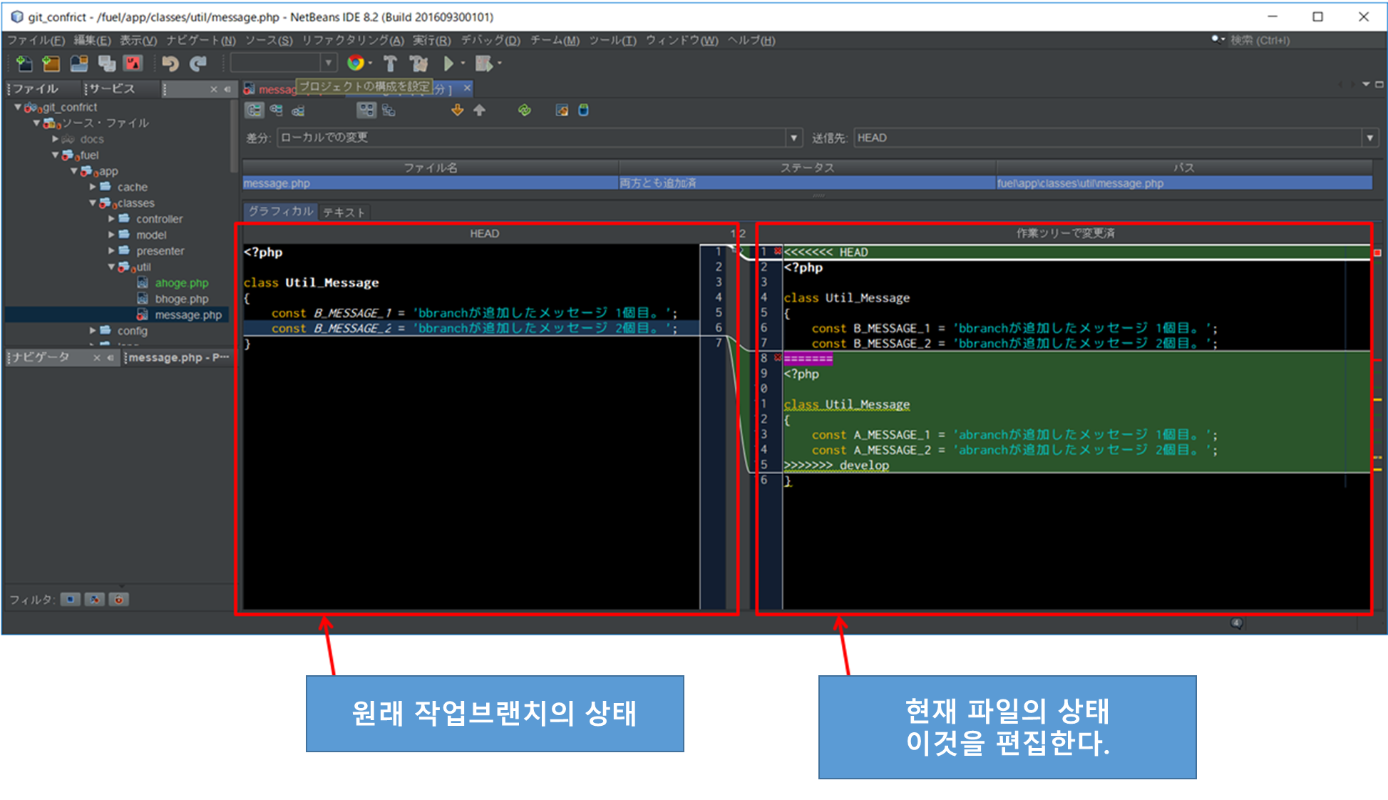 both added라고 표시되어 있는 충돌이 일어나고 있는 파일인 fuel/app/classes/util/message.php가 다음과 같이 빨갛게 표시되어 있다.